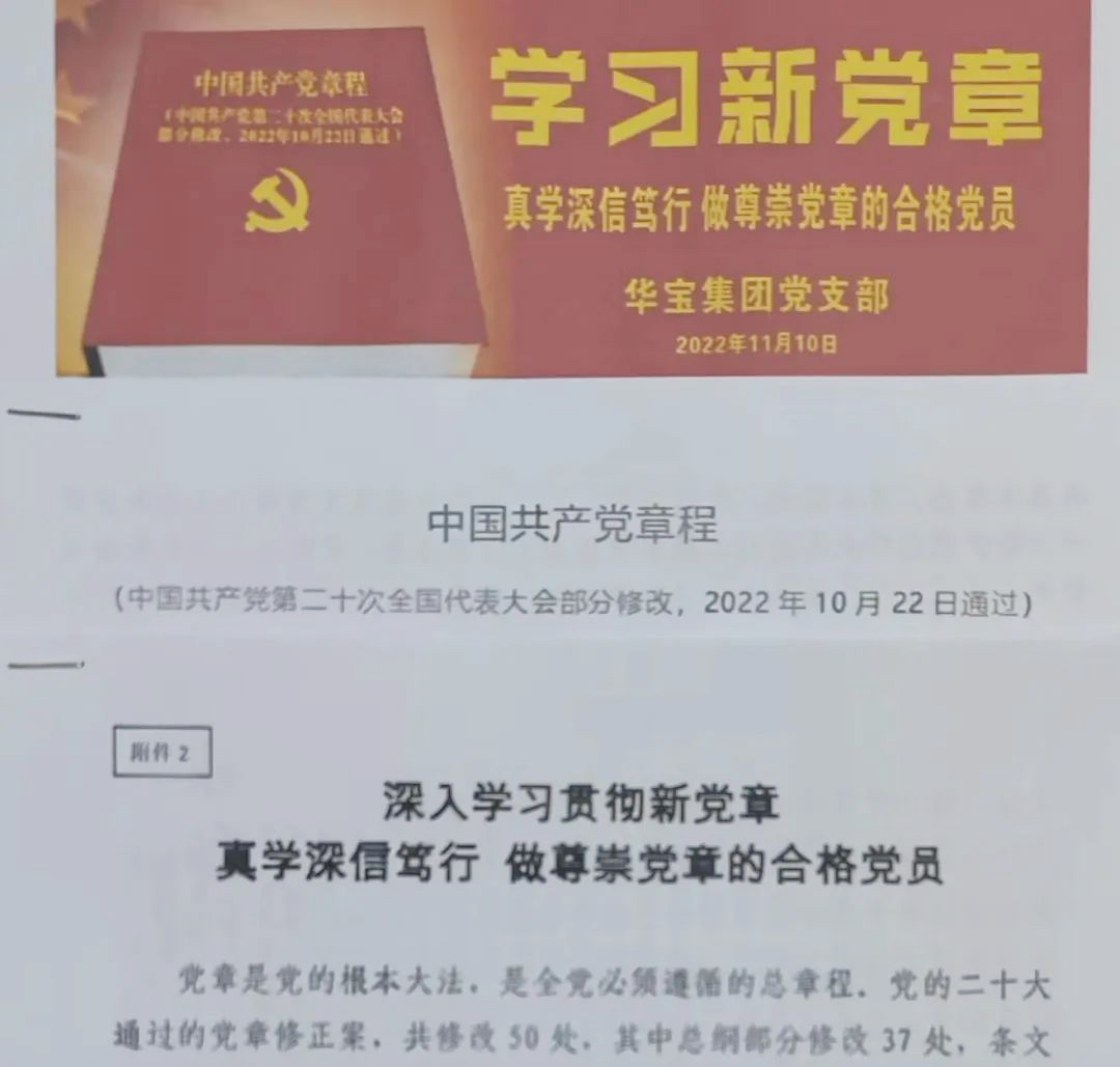 學(xué)習(xí)新黨章 做尊崇黨章的合格黨員 習(xí)近平總書記指出:“黨章是我們立黨、治黨、管黨的總章程,是全黨最基本、最重要、最全面的行為規(guī)范。”黨的二十大審議通過的《中國(guó)共產(chǎn)黨章程(修正案)》,凝聚了全黨的共同意志,切實(shí)鞏固了黨的二十大的重大政治成果,為全面建設(shè)社會(huì)主義現(xiàn)代化國(guó)家、全面推進(jìn)中華民族偉大復(fù)興統(tǒng)一了思想、意志和行動(dòng)。 2022年11月10日,華寶集團(tuán)黨支部開展了學(xué)習(xí)新黨章的活動(dòng),組織黨員逐字逐句學(xué)、原原本本學(xué),把黨章學(xué)深學(xué)透,特別是針對(duì)新修改的內(nèi)容,不時(shí)展開熱烈的討論。通過學(xué)習(xí),引導(dǎo)支部黨員嚴(yán)格遵守黨章、堅(jiān)決貫徹黨章,嚴(yán)肅維護(hù)黨章,做一名合格黨員。