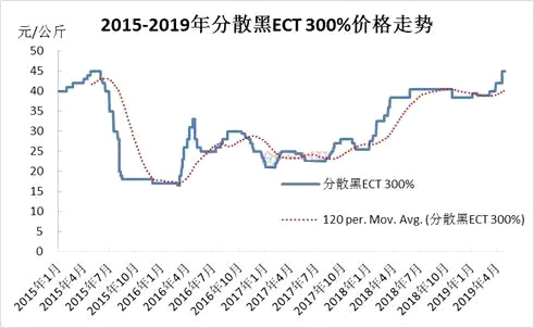 進(jìn)入2019年,國(guó)內(nèi)分散染料市場(chǎng)在經(jīng)歷小幅度回調(diào)后,再度開(kāi)始上漲模式,截至2019年4月底,分散染料市場(chǎng)價(jià)格再度站上45元/公斤一線(xiàn)(分散黑ECT 300%),于此同時(shí),分散染料市場(chǎng)也徹底收復(fù)了2015年暴跌以來(lái)所有跌幅。